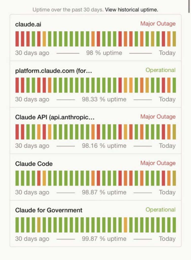 Em março, o claude.ai, a API pública e o Claude Code sofreram interrupções graves ao longo de semanas. Os painéis de status da própria empresa registraram “Major Outage” nos três serviços durante o período de 30 dias. A disponibilidade caiu de 98,93% em fevereiro para 98,21% em março. Usuários do plano Max, que paga entre US$ 100 e US$ 200 por mês e promete até 20 vezes mais uso que o Pro, reportaram esgotamento total do limite em 10 a 15 minutos de conversa com o Opus.