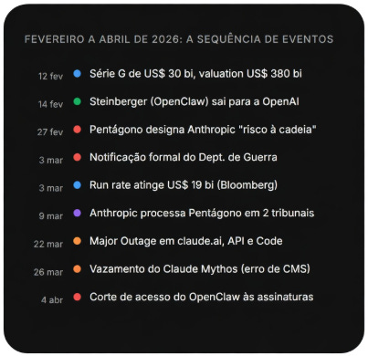 Os números contam uma história de tração gigantesca mas os números também contam outra história, que apareceu com força entre março e abril de 2026: a de uma empresa que está vendendo mais do que consegue entregar, cortando acesso de quem atrapalha a margem, comprando briga com o Pentágono e transferindo bilhões para os mesmos parceiros de nuvem dos quais tenta se livrar.