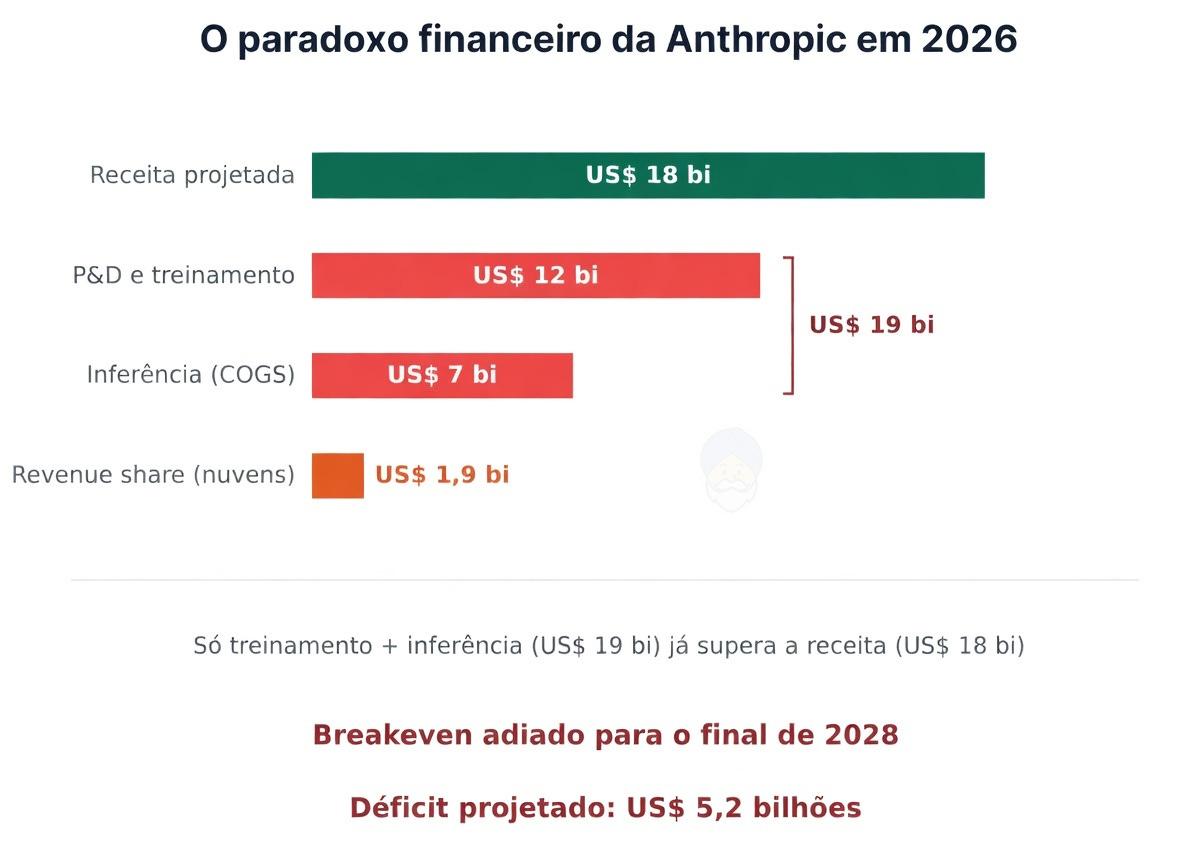 Os números explicam por quê, a projeção de gastos em pesquisa e desenvolvimento focada no treinamento dos modelos pós-Claude 4 é de US$ 12 bilhões em 2026. O custo de manter a inferência rodando para os clientes atuais consome outros US$ 7 bilhões, só a soma de treinamento e inferência dá US$ 19 bilhões, que já supera a projeção de receita de US$ 18 bilhões antes de entrar qualquer despesa com vendas, marketing ou salários dos pesquisadores.