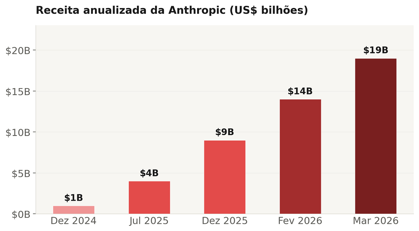 A Anthropic saiu de US$ 1 bilhão em receita anualizada em dezembro de 2024 para US$ 19 bilhões em março de 2026, nenhuma empresa de software B2B na história chegou perto dessa velocidade. O Claude Code, que só ficou disponível ao público em maio de 2025, já gera US$ 2,5 bilhões em receita anualizada, nove meses depois do lançamento, outro número que impressiona é que 4% de todos os commits públicos no GitHub já são escritos pela ferramenta. Oito das dez maiores empresas do Fortune 10 são clientes e mais de 500 empresas gastam mais de US$ 1 milhão por ano com o Claude.