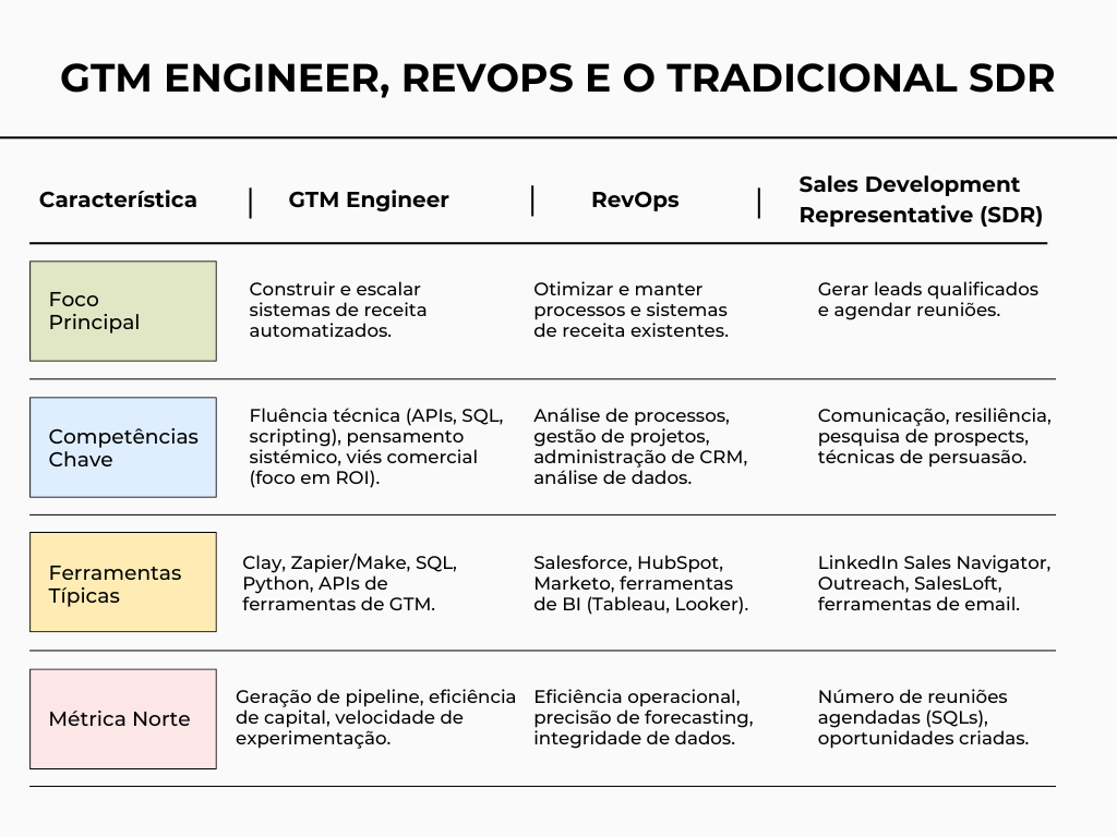GTM Engineer é o nome do jogo. Mas não é só um título bonito para substituir RevOps. É outra lógica de trabalho. Enquanto um profissional de operações cuida da manutenção de sistemas, o GTM Engineer constrói sistemas novos. Não está otimizando um CRM. Está programando motores de receita.