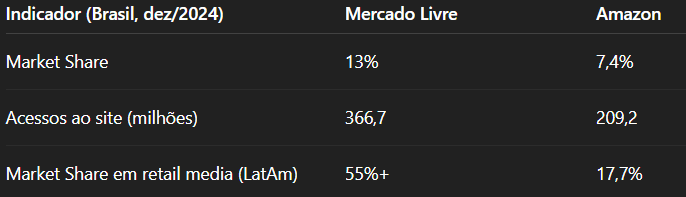 A Amazon tem recursos. Tem tecnologia. Tem marca. Analistas dizem que, se ela decidir competir pra valer, pode virar o jogo. Mas o Meli não espera.