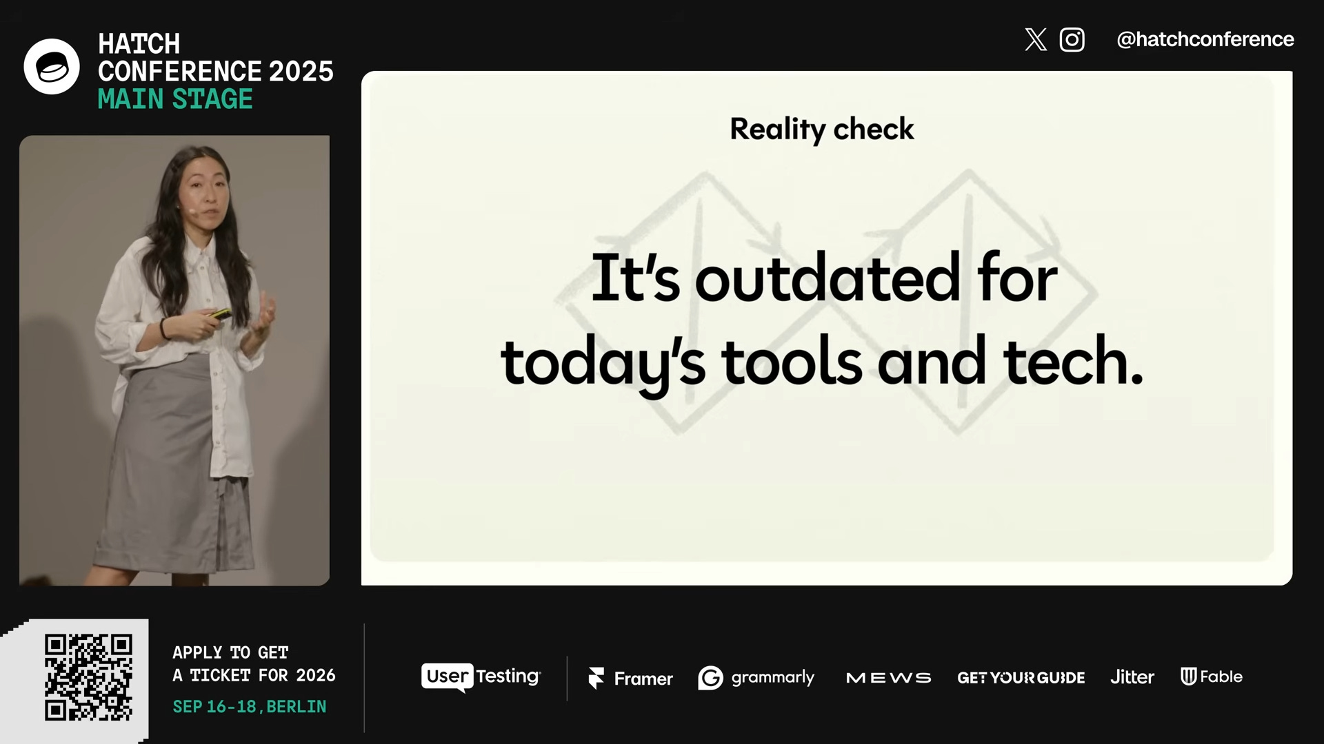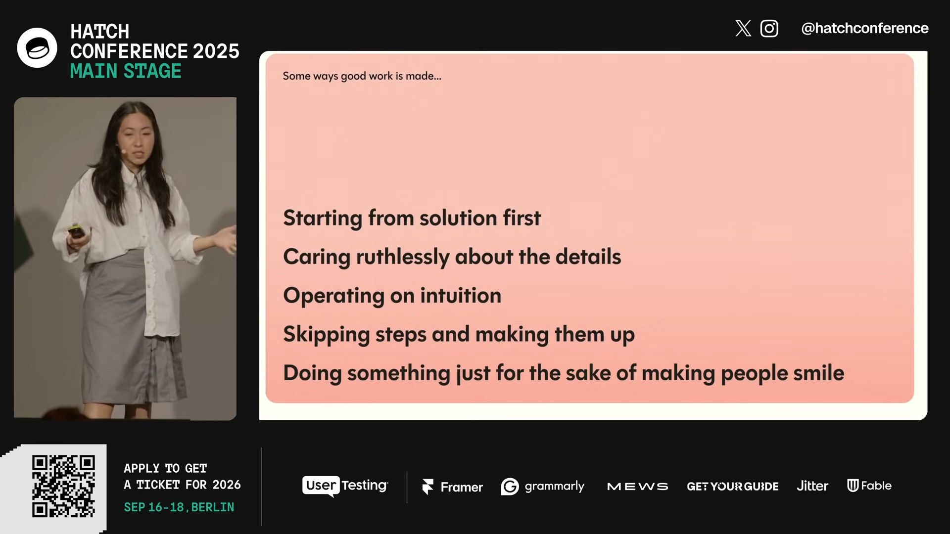 Jenny sabe disso, tanto que fecha a fala não com um processo alternativo, mas com um chamado para confiar em si mesmo. É honesto e é exatamente onde fica o desconforto: confiar em si mesmo é fácil quando você passou cinco anos na Figma e agora trabalha na Anthropic. Para quem está no segundo emprego tentando defender uma decisão de design numa reunião com stakeholders que querem ver o mapa de jornada, a intuição ainda não tem o mesmo peso institucional que o artefato.