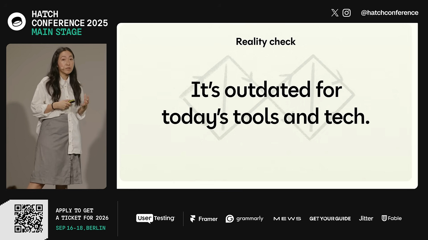 Na Hatch Conference, Jenny Wen, design lead na Anthropic e ex-diretora de design da Figma, simulou o processo perfeito: pesquisa com usuário, persona com foto gerada por IA e nome fictício, mapa de jornada emocional, brainstorm de problemas, problem statement no formato "como eu posso", brainstorm de soluções, wireframes em baixa, wireframes em alta, teste com usuários. Cada etapa com seta apontando para a próxima, depois pausou e disse que esse processo não funciona.