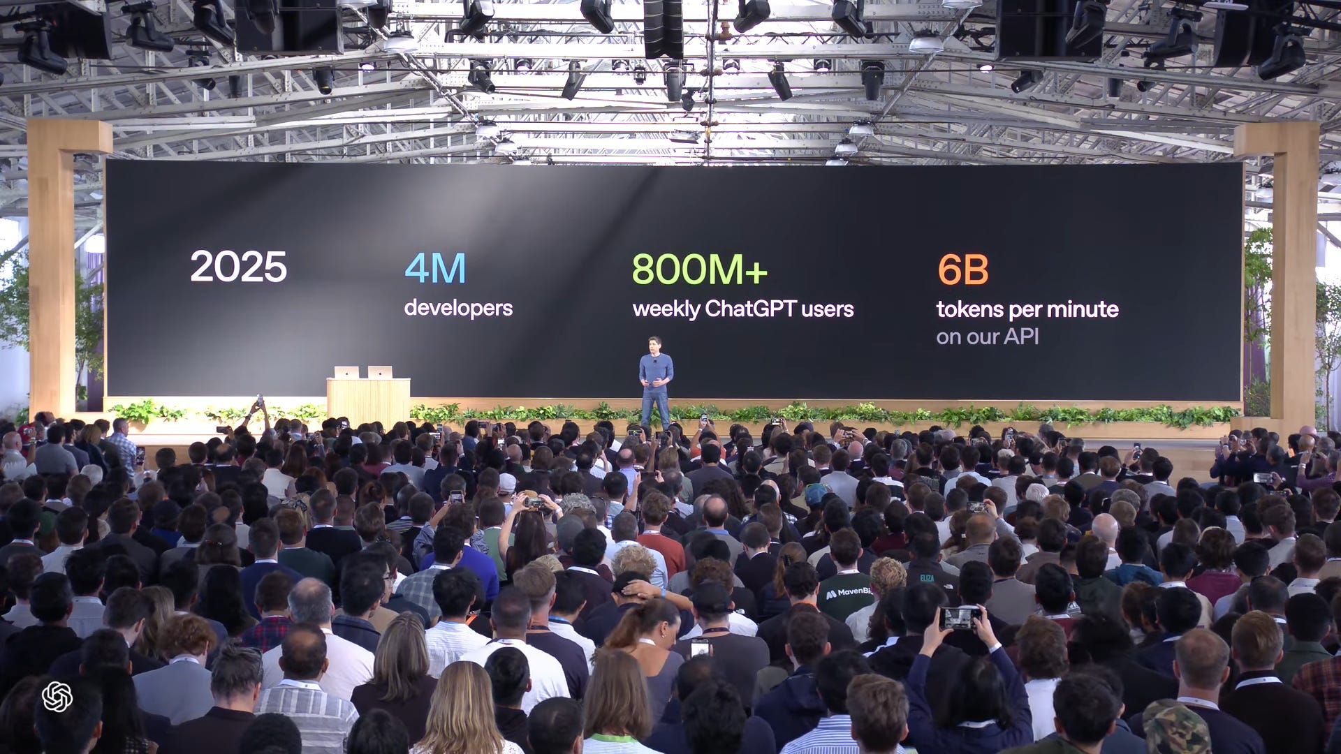 Dois anos após o primeiro DevDay, os números dobraram de escala: 4 milhões de desenvolvedores e 800 milhões de usuários semanais. A API processa 6 bilhões de tokens por minuto. A OpenAI já não compete apenas com outras empresas de IA, mas com as próprias plataformas que definem o cotidiano digital, Google, Apple, Meta.