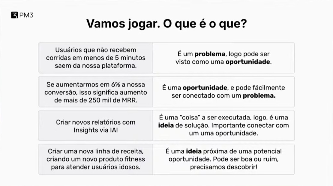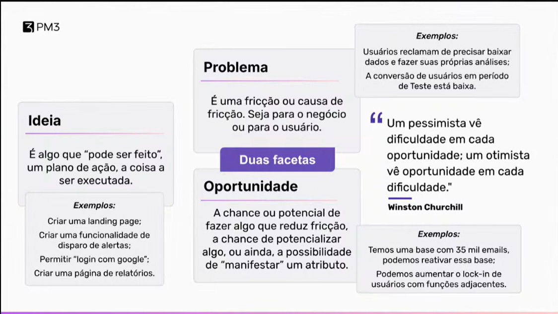 Ideia, problema e oportunidade são categorias diferentes e pedem ações diferentes. Uma ideia é um plano de ação num vácuo: criar uma landing page, permitir login com Google, lançar um módulo de relatórios com IA. Problema tem dado, tem comportamento observável, tem fricção identificada num usuário real. Oportunidade aparece quando você olha para esse problema e enxerga o potencial de reduzir a fricção e gerar algo positivo para o negócio.