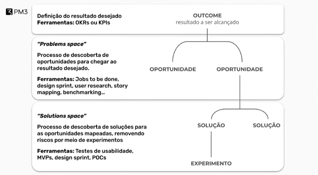 Abaixo do resultado ficam as oportunidades, o que pode estar impedindo esse crescimento, onde está a fricção, o que o usuário está sinalizando nos dados. Abaixo das oportunidades ficam as soluções candidatas. Abaixo das soluções ficam os experimentos, os testes AB, os MVPs, as POCs que vão reduzir o risco antes de escalar.