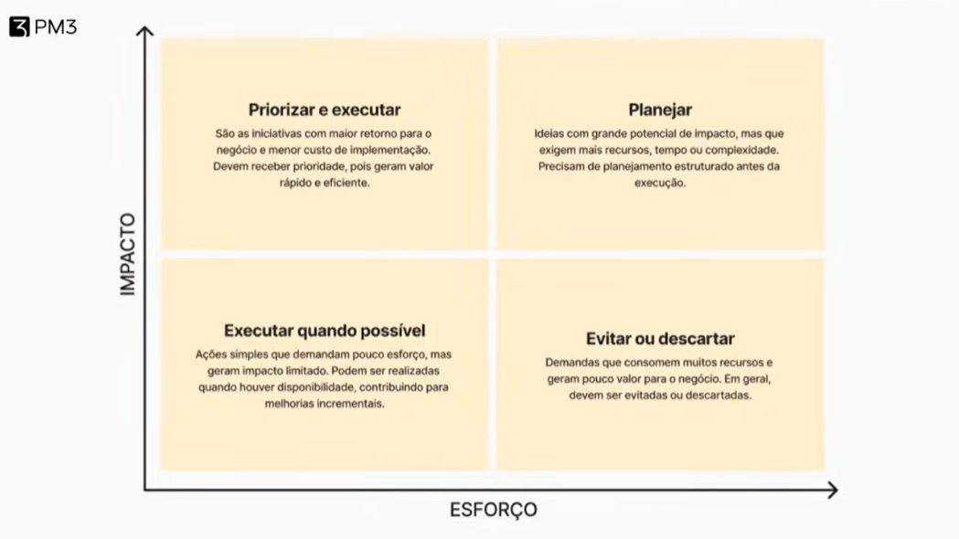 A matriz parece mecânica mas o trabalho acontece nas discussões para preenchê-la, como bem disse Eduardo que esforço e impacto precisam ser avaliados com múltiplos stakeholders, incluindo o time técnico, porque a mesma iniciativa vai ter pesos completamente diferentes dependendo da arquitetura existente. O PM que não entende nem superficialmente essa arquitetura vai errar sistematicamente no eixo de esforço, colocando no quadrante de prioridade coisas que vão travar na primeira sprint de execução.