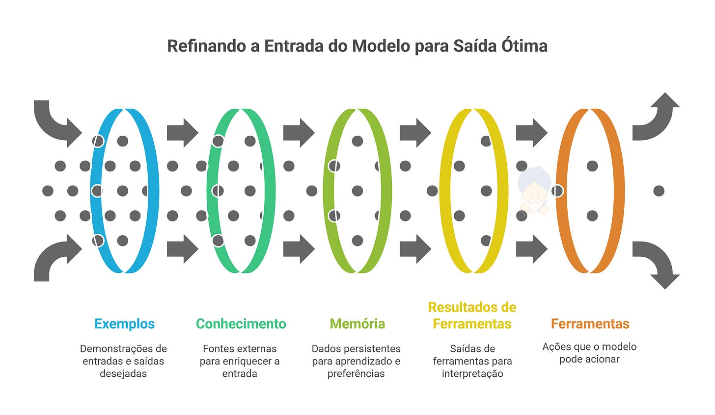 Use o diagrama como referência e trate cada bloco como um “tipo de evidência” que você entrega ao modelo. O trabalho do PM é decidir a ordem, o peso e o orçamento de cada evidência.