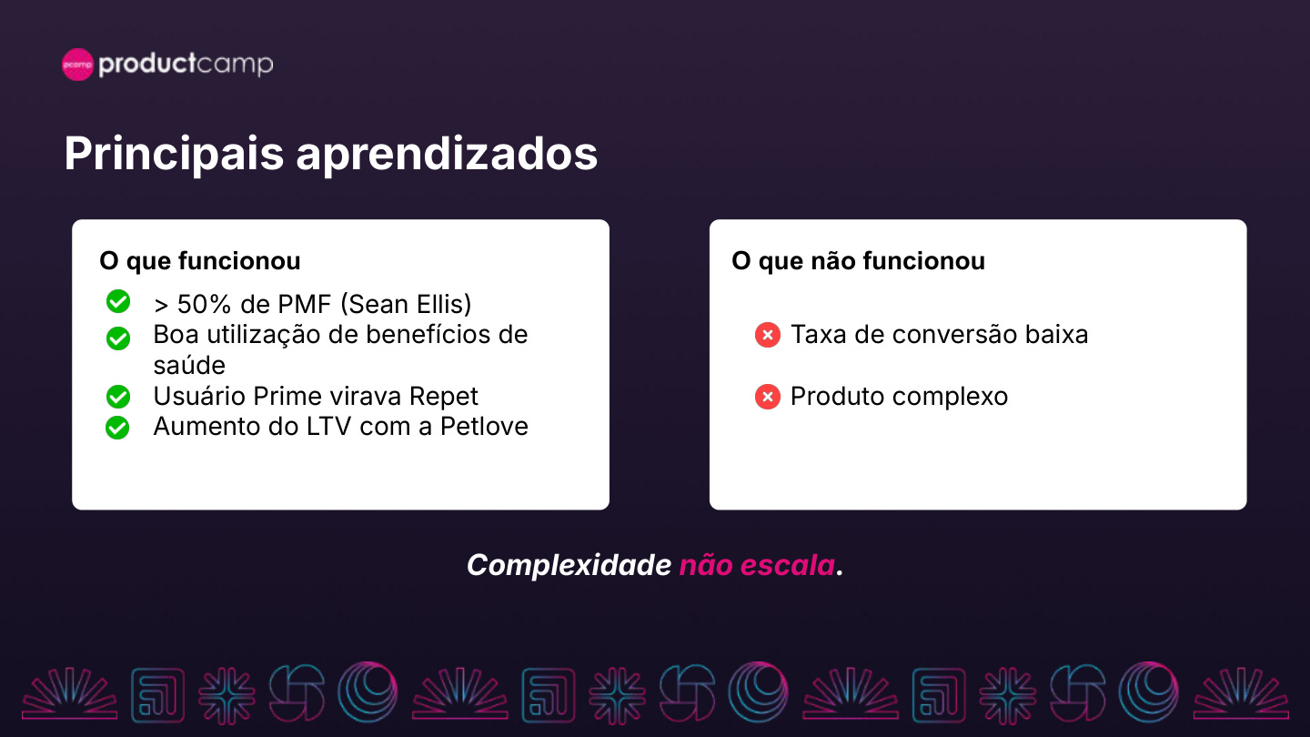 No lançamento, alguns sinais foram animadores: mais de 50% de PMF pelo critério de Sean Ellis, boa utilização de benefícios de saúde e aumento do LTV com a Petlove. Por outro lado, a conversão foi baixa, e o produto começou a mostrar seu custo oculto: complexidade.