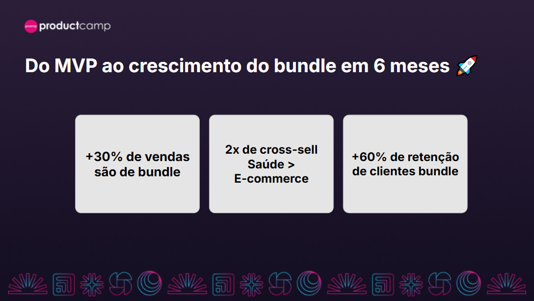 Em seis meses, o bundle passou do MVP para impacto relevante no negócio. Os dados apresentados são fortes:+30% das vendas passaram a ser de bundle, houve 2x de cross-sell (Saúde > E-commerce) e +60% de retenção de clientes bundle.