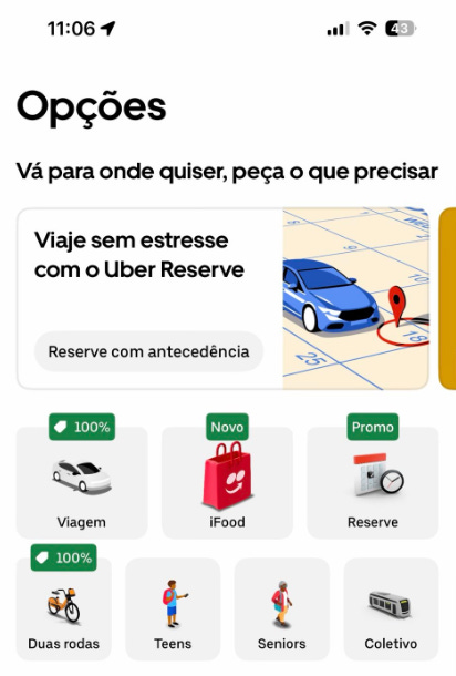 No iFood, surge a opção de mobilidade. O usuário solicita uma corrida, escolhe categoria, acompanha o motorista e paga sem sair do app. Na Uber, a aba de delivery deixa de ser residual e passa a operar com todo o inventário do iFood, incluindo restaurantes, mercados e farmácias.