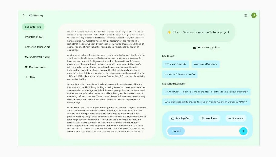 A ideia foi parar nas mãos de uma equipe do Google Labs que já trabalhava numa outra direção: uma ferramenta de pesquisa ancorada nos documentos do próprio usuário. Os dois impulsos se juntaram. O que surgiu foi o NotebookLM, que começou com seis semanas de desenvolvimento, quatro ou cinco pessoas, e nenhum roadmap de produto formal. O nome original era Project Tailwind, que a propósito era claramente um nome ruim comercialmente falando.