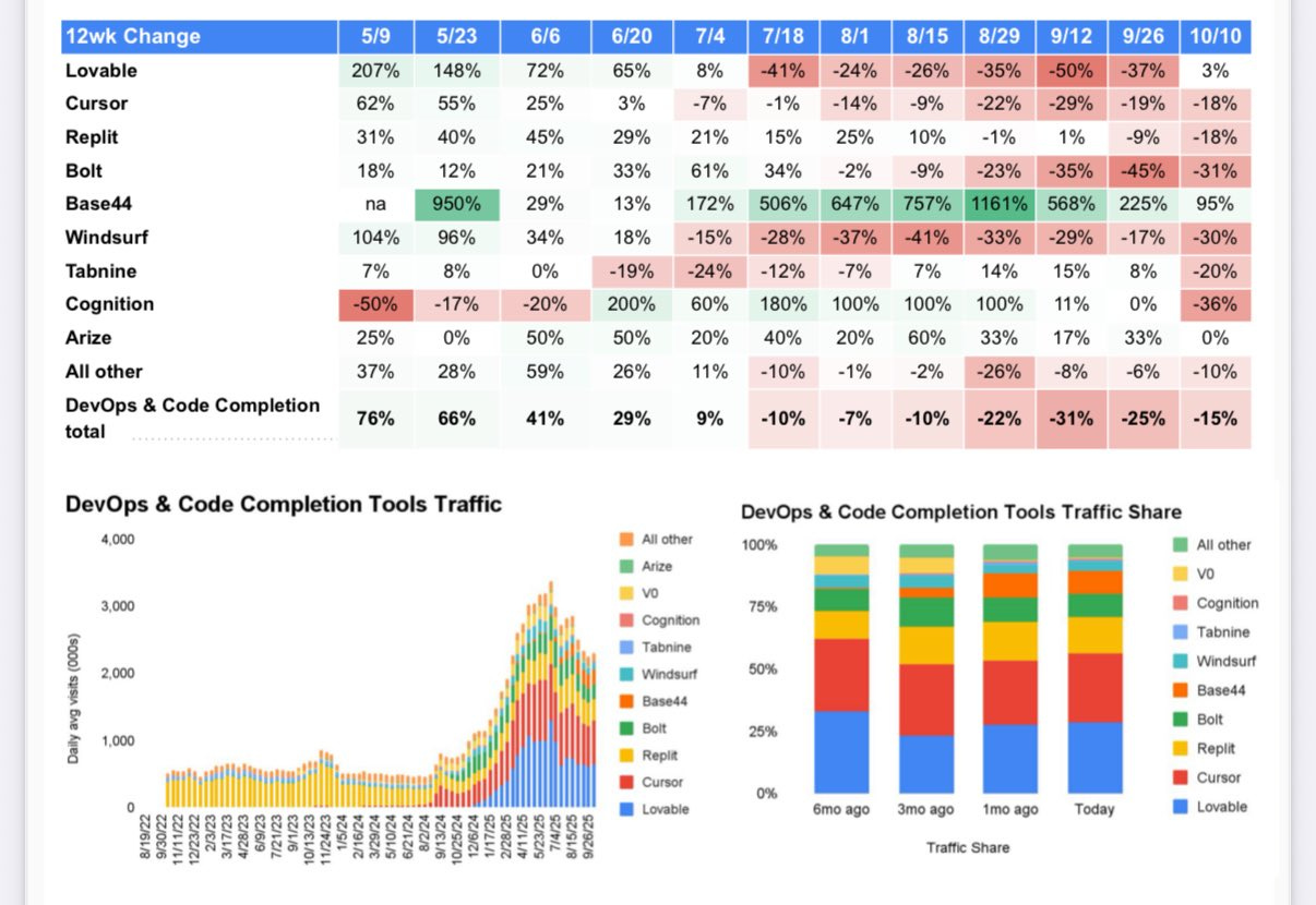 Entre junho e setembro de 2025, o acesso às principais plataformas despencou. Lovable caiu de 21,2 milhões para 19,1 milhões de visitas (-10,1%), Replit perdeu 21,5%, Bolt recuou 11,9% e o v0 da Vercel chegou a colapsar 60% após mudar seu modelo de preços. O problema não é falta de interesse por IA.