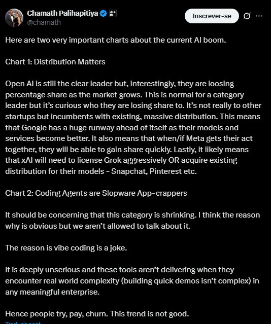 Aqui estão dois gráficos muito importantes sobre o atual boom da IA. Gráfico 1: A distribuição importa A Open AI ainda é a líder absoluta, mas, curiosamente, está perdendo participação percentual à medida que o mercado cresce. Isso é normal para uma líder de categoria, mas é curioso para quem ela está perdendo participação. Não é exatamente para outras startups, mas para empresas tradicionais com distribuição massiva existente. Isso significa que o Google tem um enorme caminho pela frente à medida que seus modelos e serviços se aprimoram. Isso também significa que, quando/se a Meta se organizar, poderá ganhar participação rapidamente. Por fim, provavelmente significa que a xAI precisará licenciar a Grok agressivamente OU adquirir a distribuição existente para seus modelos – Snapchat, Pinterest etc. Gráfico 2: Agentes de codificação são destruidores de aplicativos desleixados Deve ser preocupante que essa categoria esteja diminuindo. Acho que o motivo é óbvio, mas não temos permissão para falar sobre isso. O motivo é que a codificação de vibração é uma piada. Isso é profundamente pouco sério e essas ferramentas não funcionam quando encontram complexidade do mundo real (criar demonstrações rápidas não é complexo) em nenhum empreendimento significativo. Por isso, as pessoas tentam, pagam, mudam. Essa tendência não é boa.