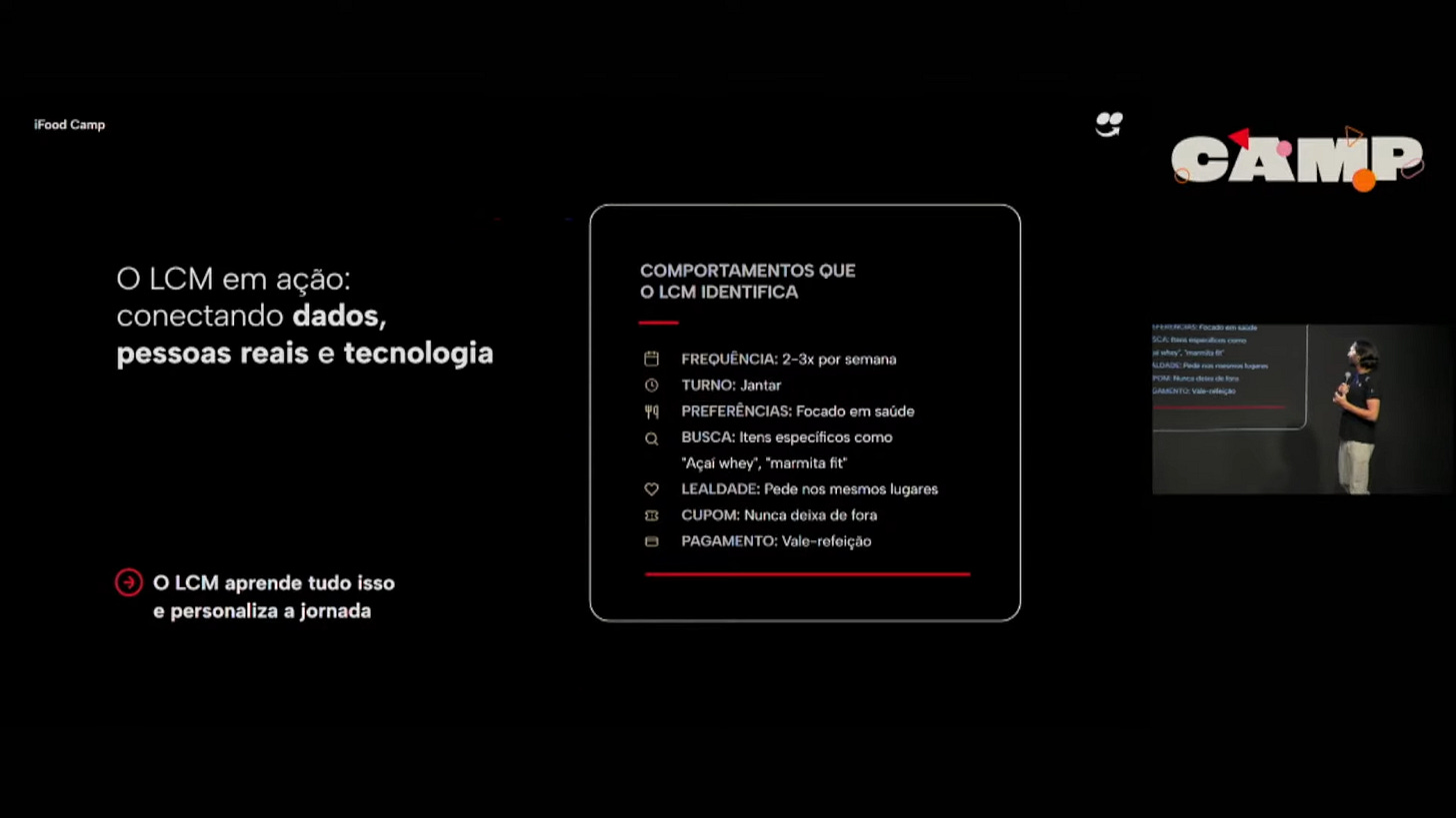 A personalização que o LCM viabiliza vai além do carrossel de restaurantes na home. O sistema entende que um determinado usuário compra três vezes por semana, sempre no jantar, prefere comida saudável, gosta de variar os restaurantes e costuma usar cupons. Esse perfil microsegmentado informa o que aparece na tela, quando aparece, em que formato, com qual oferta. Lucas citou os ganhos de performance em CRM como um nível que ele disse nunca ter imaginado possível ao longo de toda a carreira, pois ferramentas genéricas não chegam lá porque não sabem quem é aquela pessoa.