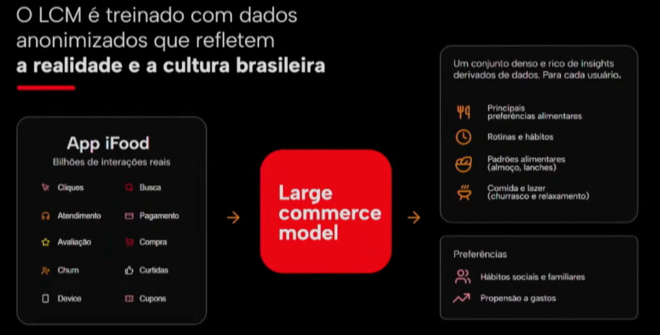 O iFood processa 80 milhões de pedidos por mês só na categoria de lanches. Esse número existe porque a empresa passou anos construindo um modelo proprietário treinado com dados comportamentais de dezenas de milhões de usuários brasileiros: frequência de compra, turno preferido, tipo de culinária, tolerância a preços, fidelidade a restaurantes. O modelo se chama LCM, Large Commerce Model, ele não usa GPT nem Claude, foi construído com dado que só existe aqui no Brasil.