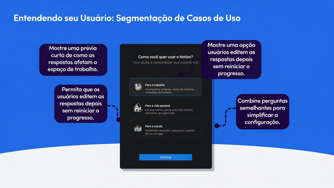 A solução arquitetônica que o Notion implementou parte de uma premissa simples: antes de ensinar qualquer funcionalidade, captura a intenção. Na prática isso significa uma ou duas perguntas no início do fluxo de cadastro, leves o suficiente para não criar atrito, mas específicas o suficiente para divergir a experiência em direções completamente distintas. O usuário que indica que quer organizar projetos pessoais segue por uma trilha. Quem sinaliza que vai colaborar com colegas vai para outra. Quem representa uma empresa de grande porte cai num fluxo diferente de onboarding administrativo e técnico.