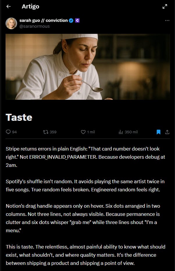 “This is taste. The relentless, almost painful ability to know what should exist, what shouldn't, and where quality matters. It's the difference between shipping a product and shipping a point of view.”