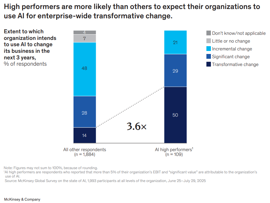 Essas empresas tratam IA menos como automação pontual e mais como motor de transformação. São muito mais propensas a redesenhar workflows de ponta a ponta, escalar rapidamente casos de uso, usar IA em várias funções críticas e levar agentes para estágio de escala, não só teste.