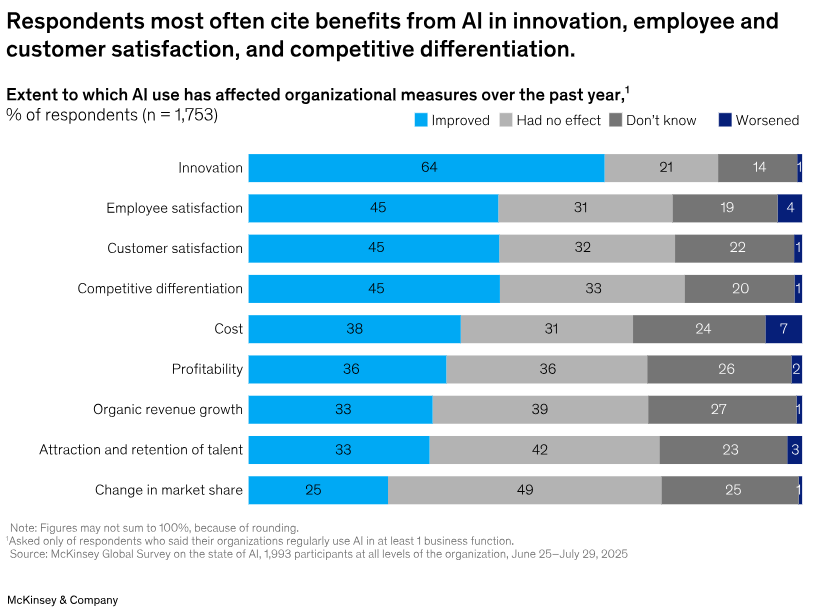Mesmo assim, o uso se diversificou. A maior parte das empresas já aplica IA em mais de uma função, e metade usa em três ou mais áreas. TI, marketing e vendas continuam entre as mais comuns, com destaque para engenharia de software, manufatura e infraestrutura de TI quando o assunto é redução de custo.