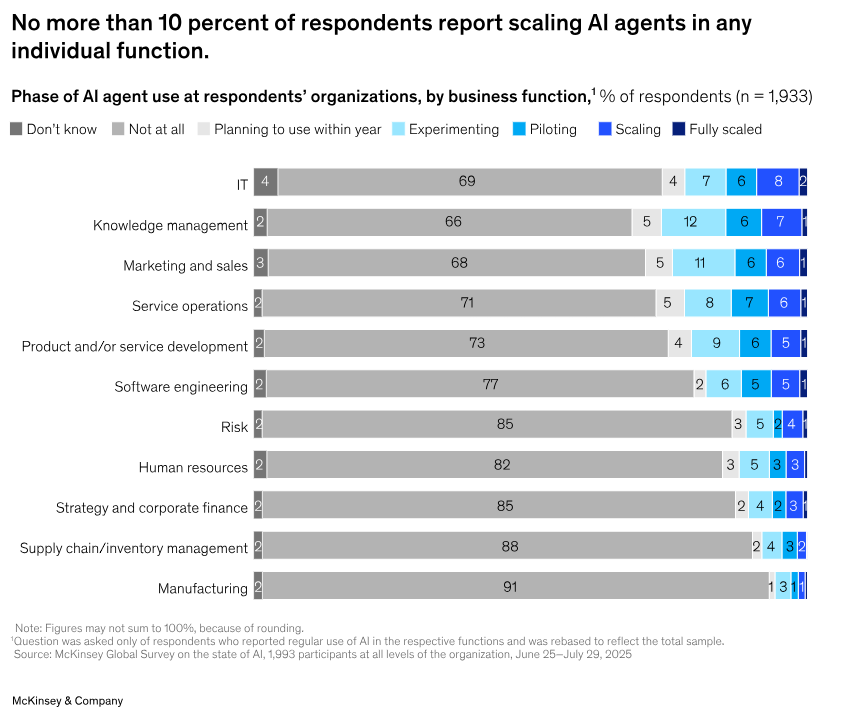 Só que, quando você olha por área, em nenhuma função mais de 10% dos respondentes afirmam estar escalando agentes de fato. Na prática, agentes ainda são piloto de luxo em poucos lugares, com mais tração em TI e gestão do conhecimento, e mais presença em setores como tecnologia, mídia, telecomunicações e saúde.