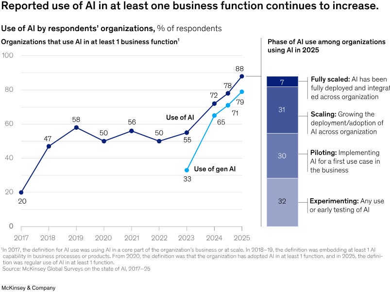 Três anos depois do boom do ChatGPT, a fotografia é clara. Quase todas as empresas dizem usar inteligência artificial em algum lugar da operação, mas poucas conseguem provar impacto real no resultado. Segundo o novo estudo “The state of AI in 2025”, da McKinsey, 88% dos respondentes afirmam que suas empresas já usam IA em pelo menos uma área, contra 78% no ano passado. A adoção se espalhou. O valor, nem tanto.