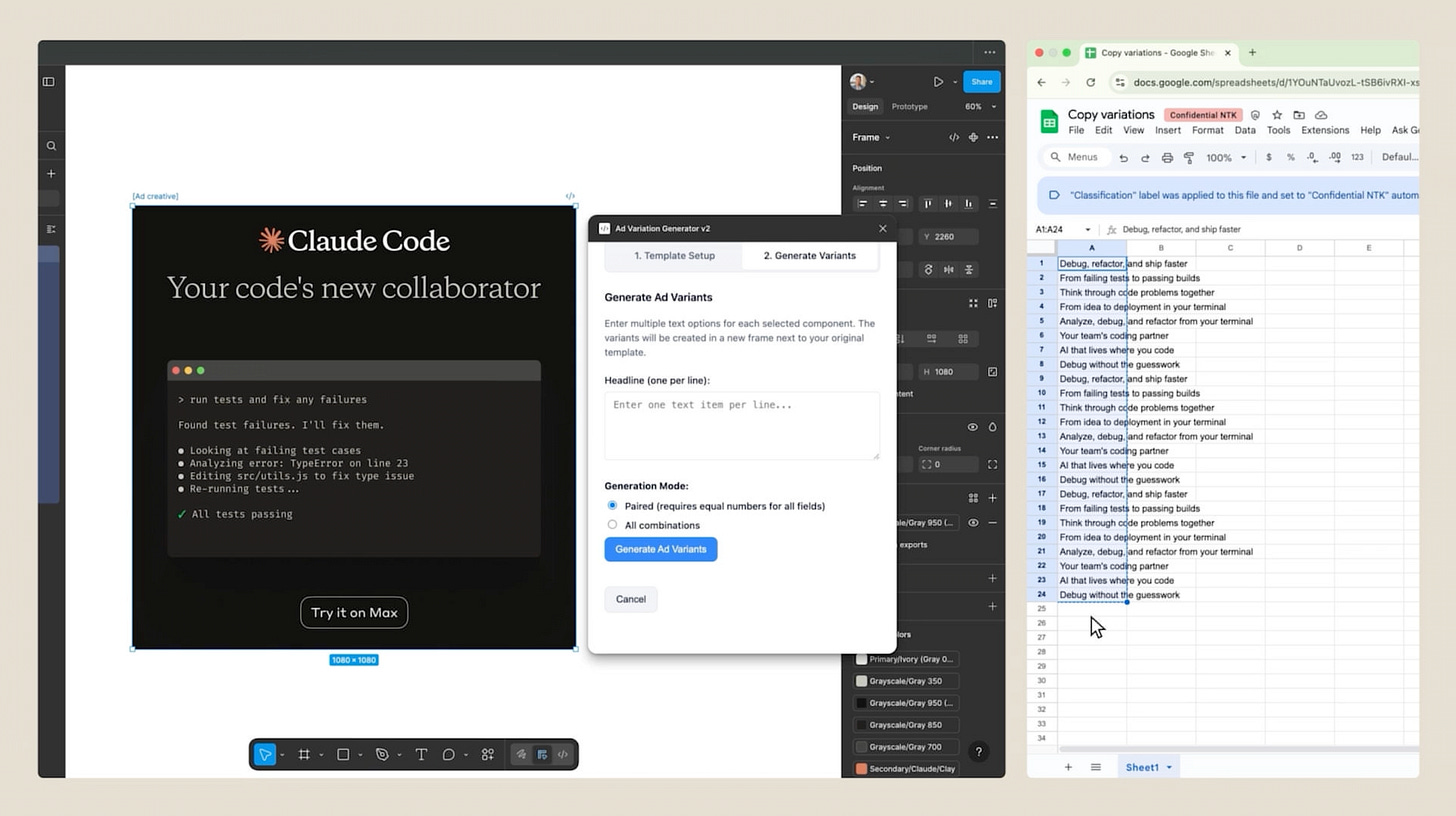 Para criativos visuais, construiu um plugin no Figma que gera até 100 variações de anúncios trocando títulos e descrições entre frames, em múltiplos formatos simultaneamente. O prompt inicial para o Claude Code foi: “Eu trabalho no Figma e quero resolver o problema de copiar e colar repetitivamente. Você consegue me ajudar a construir um plugin?” Uma hora depois tinha um protótipo funcional. Um processo que levava 30 minutos por lote passou a levar 30 segundos.