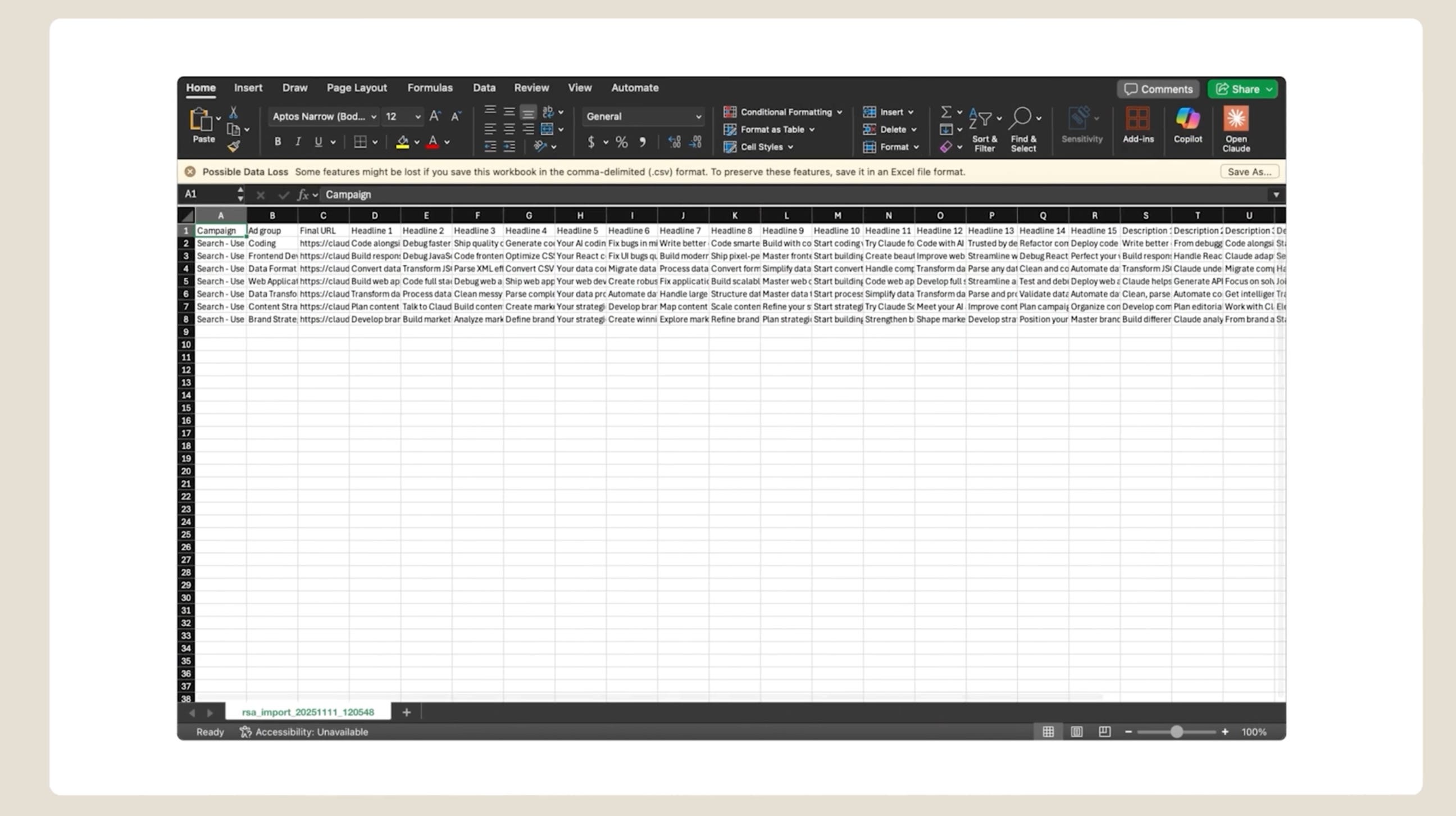 O workflow de Google Ads que construiu com Claude Code processa um CSV com centenas de anúncios existentes, identifica os de pior performance e gera variações novas respeitando os limites da plataforma: 30 caracteres para títulos, 90 para descrições. A divisão em dois sub-agentes separados, um para títulos e outro para descrições, foi a decisão técnica mais importante do projeto. Tentar fazer os dois num único agente produzia resultados mediocres.